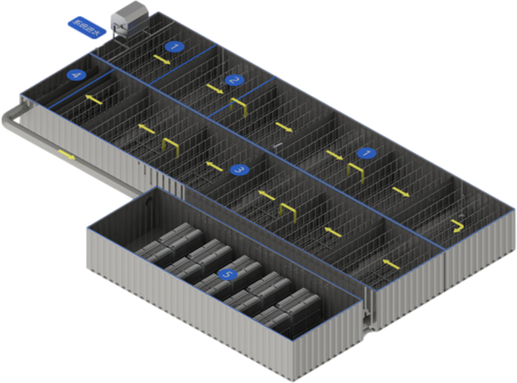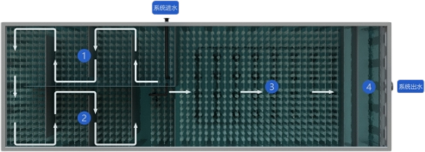 是一种新型高效往复式生物电化学反应技术,主要采用折流往复式厌氧和缺氧、高效反应澄清区等技术组成,无需传统二沉池,污泥浓度高达(6-10g/L),同时采用改性生物炭负载铁形成生物电化学系统,使生物阴极接受来自阳极的电子进行生物反硝化作用,实现高效脱氮除磷,高效去除有机污染物质,出水更优质稳定。
