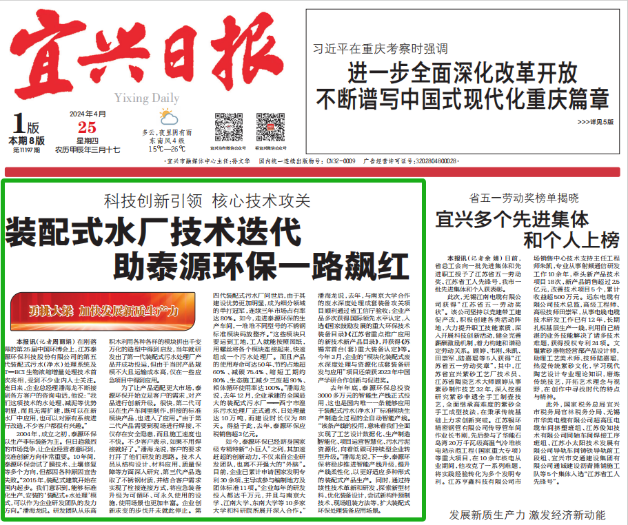 《宜兴日报》头版头条!3044永利集团积木式装配式水厂引领行业新风口