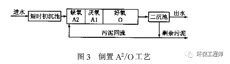 解决这一问题一般需要从两个方面来考虑:一是从工艺外部采取措施,增加进水易降解COD的数量,例如取消初沉池,污泥消化液回流,将初沉池改为酸化池等都有一定作用,还可考虑外加碳源的方法。实际中以外加碳源为主;二是从工艺内部考虑,权衡利弊,更合理地为反硝化和释磷分配碳源,常规脱氮除磷工艺总是优先照顾释磷的需要,把厌氧区放在工艺的前部,缺氧区置后。这种做法法当然是以牺牲系统的反硝化速率为前提。释磷本身并不是脱氮除磷工艺的最终目的。就工艺的最终目的而言。把厌氧区前置是否真正有利,利弊如何,是值得进一步研究的。根据对厌氧有效释磷可能并不是好氧过度吸磷充分必要条件的新认识,倒置A2/O工艺(见图3)将缺氧区放在工艺最前端,厌氧区置后。经过这种改变,反硝化菌可以优先获得碳源,反硝化速率得到大幅度提高。同时,原来困扰脱氮除磷工艺的硝酸盐问题不存在了,所有污泥都将经历完整的释磷和吸磷过程,除磷能力不仅未受影响,反而有所增强。这种新的碳源分配方式对脱氮除磷工艺的实践和机理研究都有重要意义。