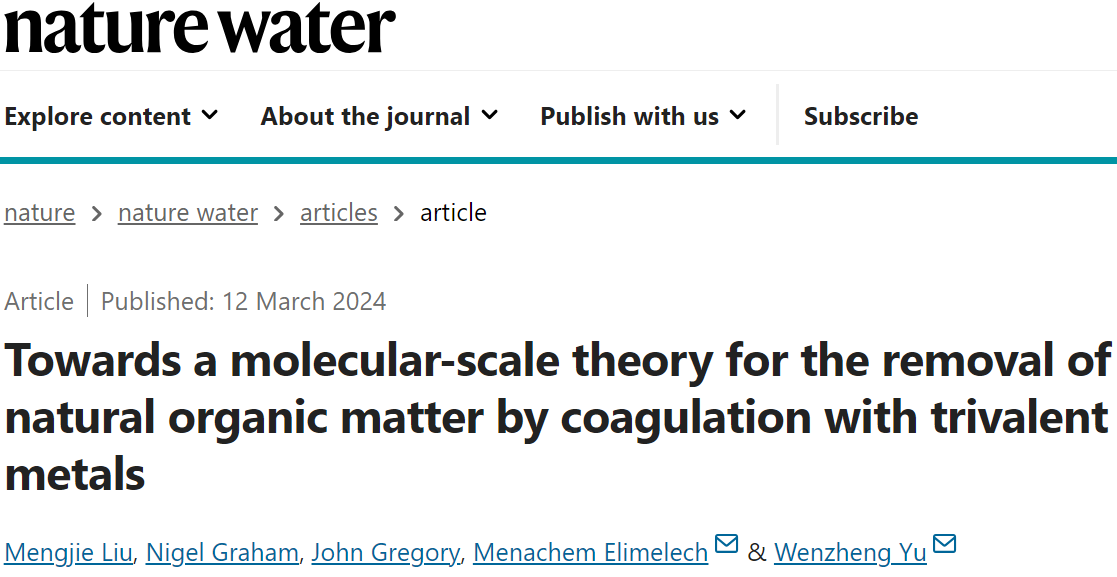 参考资料:1.Liu, M., Graham, N., Gregory, J. et al. Towards a molecular-scale theory for the removal of natural organic matter by coagulation with trivalent metals. Nat Water 2, 285–294 (2024). https://doi.org/10.1038/s44221-024-00212-x