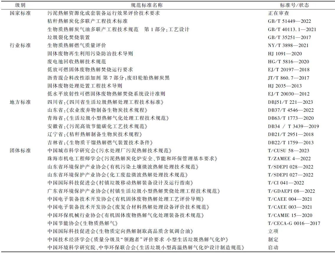 关于有机固废热解的相关标准也不在少数。国家标准有《污泥热解资源化成套装备运行效果评价技术要求》、GB/T51449—2022《秸秆热解炭化多联产工程技术标准》、GB/T40113.1—2021《生物质热解炭气油多联产工程技术规范第1部分:工艺设计》,也有相应的行业标准、地方标准和团体标准针对工业废物、生物质、垃圾、污泥等的热解技术进行了规范。