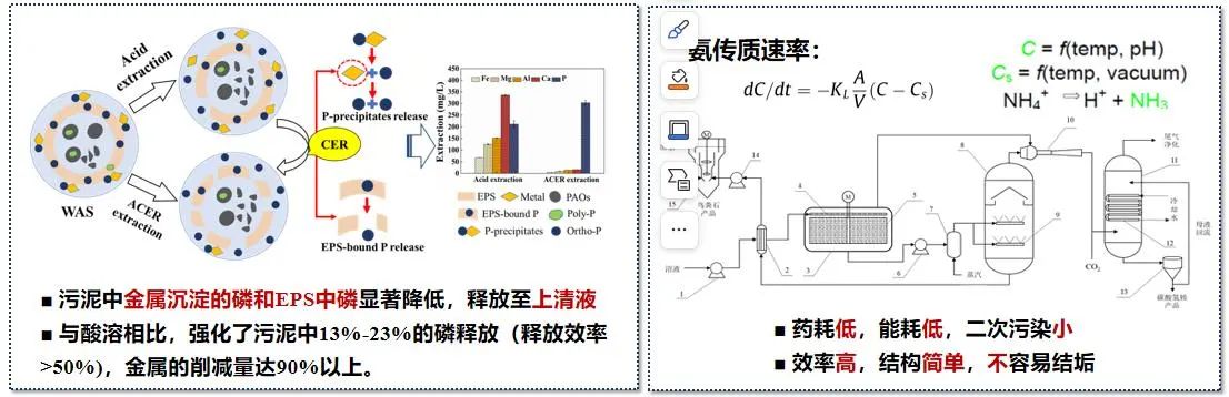 基于酸性离子交换树脂靶向清洁磷提取技术,开发了沼液不加碱负压汽提脱氨新方法,污泥释磷效率>50%,氨氮回收率达83-90%。