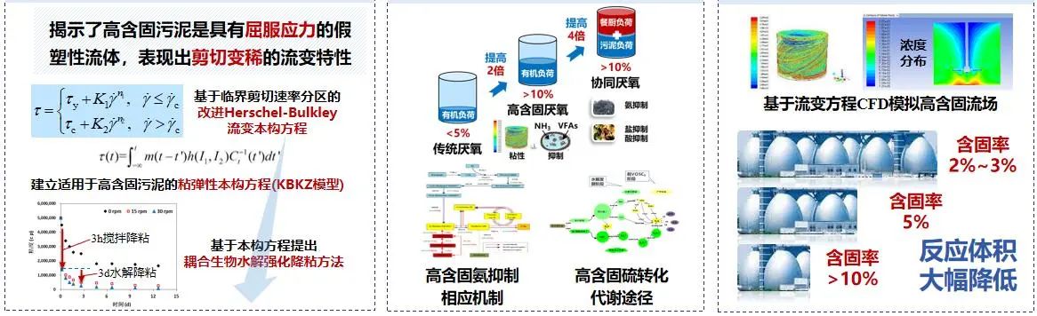团队通过对污泥复杂结构解析,揭示了污泥生物抗降解机制,突破了重构固液界面、诱导电子-质子传递新原理,率先提出了污泥高含固厌氧消化理论,创建了污泥高级厌氧消化增效调控理论体系。