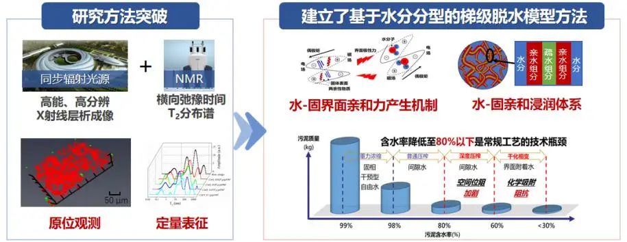 通过建立基于水分分型的梯级脱水模型方法,发现结合水的空间位阻和界面亲和是污泥水-固分离关键碍阻因子,突破了污泥水-固微尺度赋存状态的原位可视化、无损定量化瓶颈。