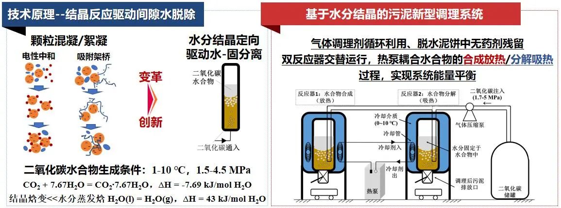 基于水分结晶的污泥新型调理系统,实现了污泥水-固分离由颗粒混凝/絮凝向水分定向迁移的变革式创新。