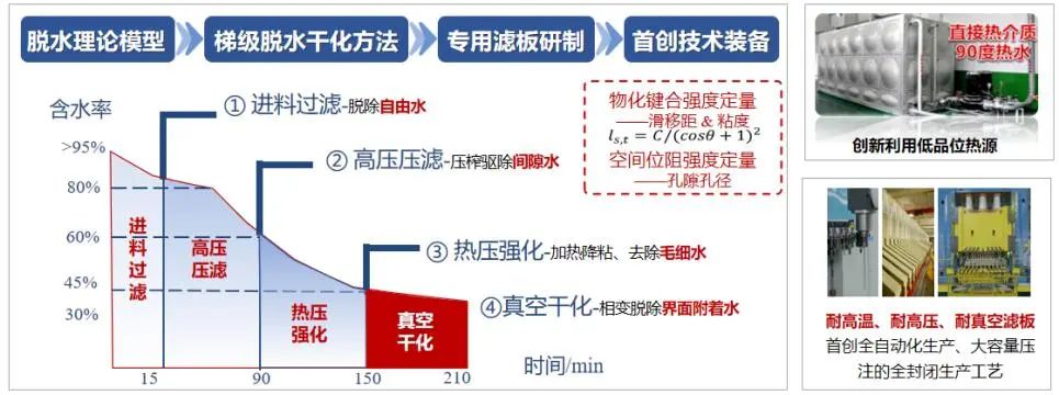 攻克了压滤脱水耦合真空干化的梯级驱水精准调控关键技术,提出了基于低品位热源的污泥真空干化新方法,综合能耗比传统技术降低65%。